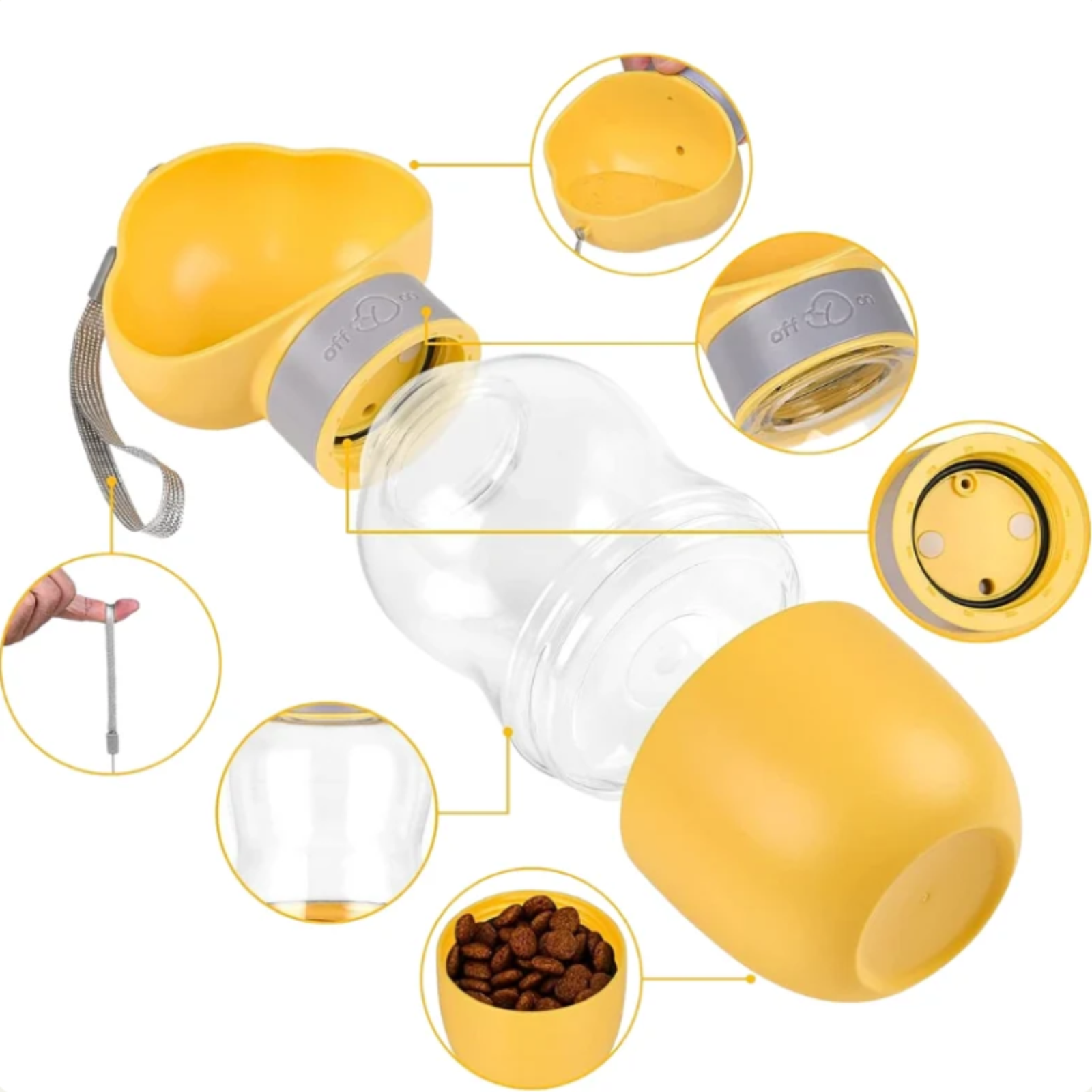 Este práctico accesorio 2 en 1 combina un bebedero portátil con un depósito para alimento seco, ideal para paseos, viajes o salidas al aire libre con tu mascota.