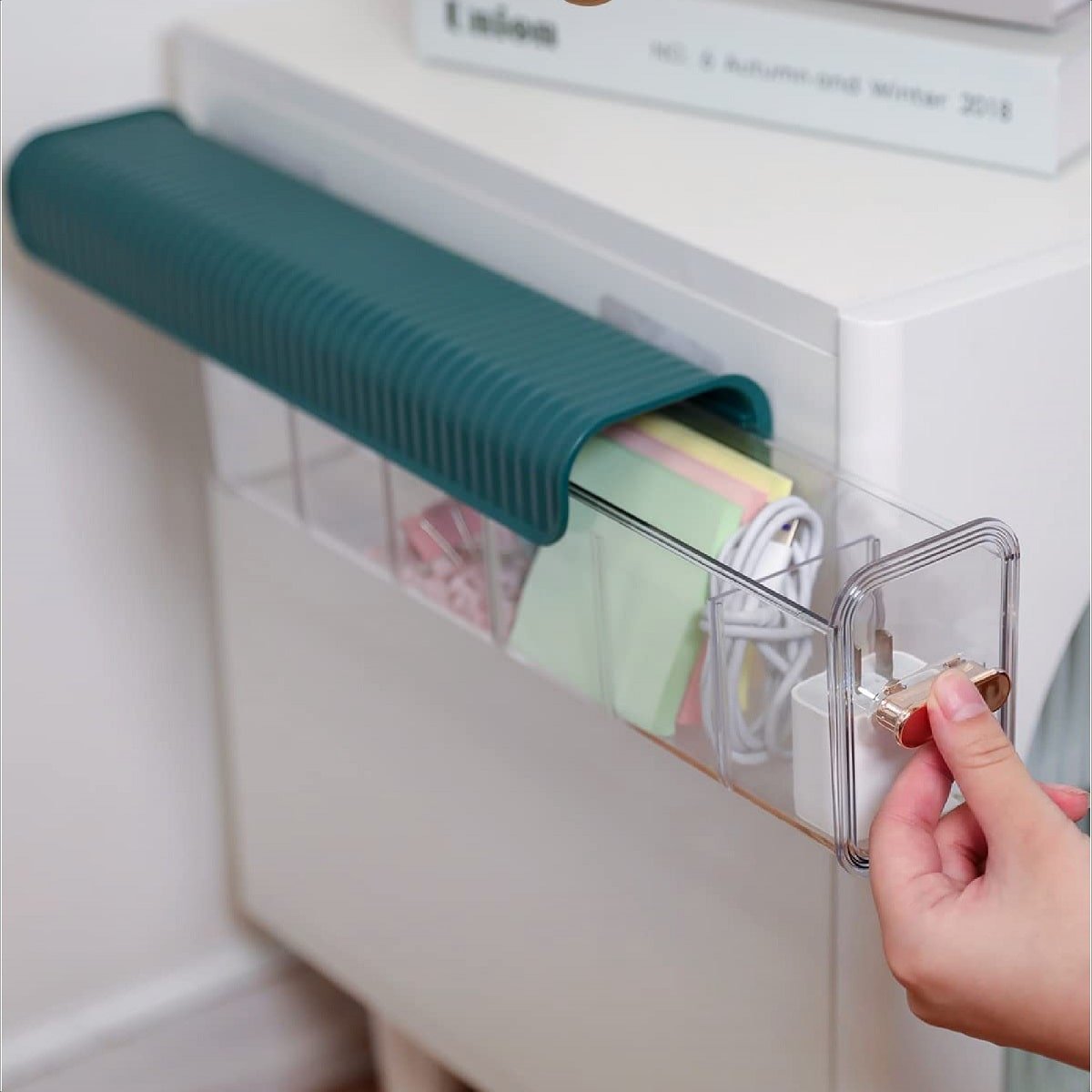 Solo debes limpiar la superficie donde deseas instalarlo, retirar la película protectora del adhesivo y fijarlo firmemente en una superficie lisa como madera, cerámica, vidrio o metal. Luego, desliza el cajón y comienza a organizar tus artículos de forma práctica y segura.