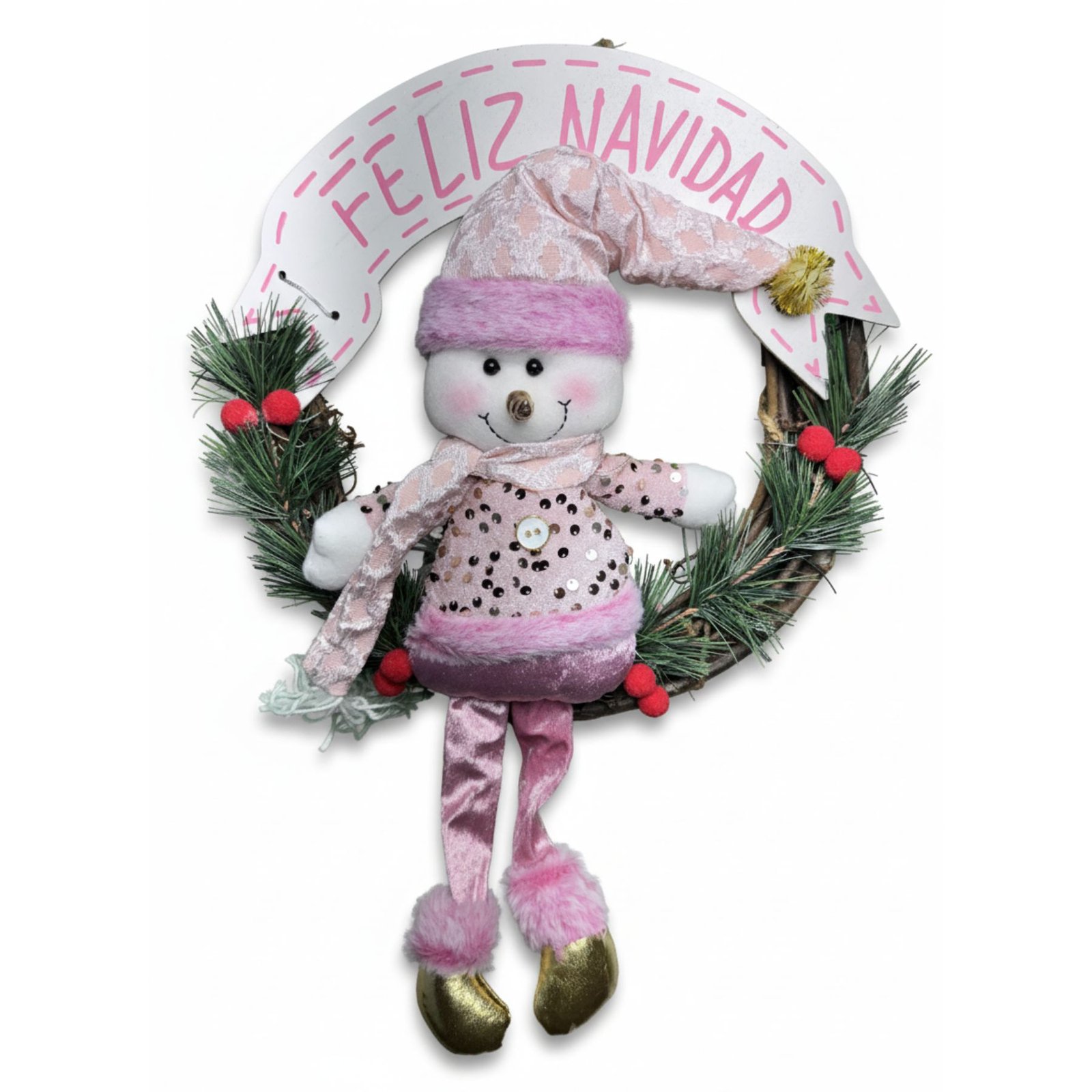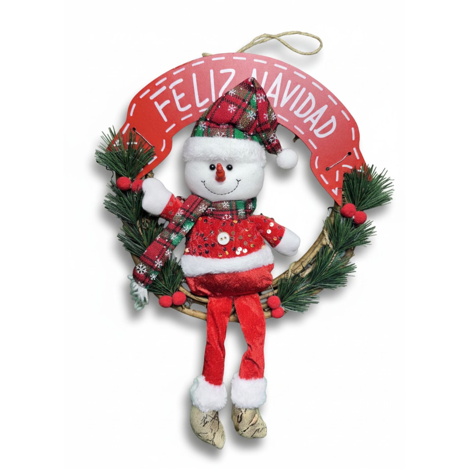 La corona navideña con luz es un adorno ideal para dar la bienvenida con un toque cálido y festivo. Su diseño tradicional con muñeco de nieve y detalles decorativos ilumina y embellece cualquier espacio del hogar.