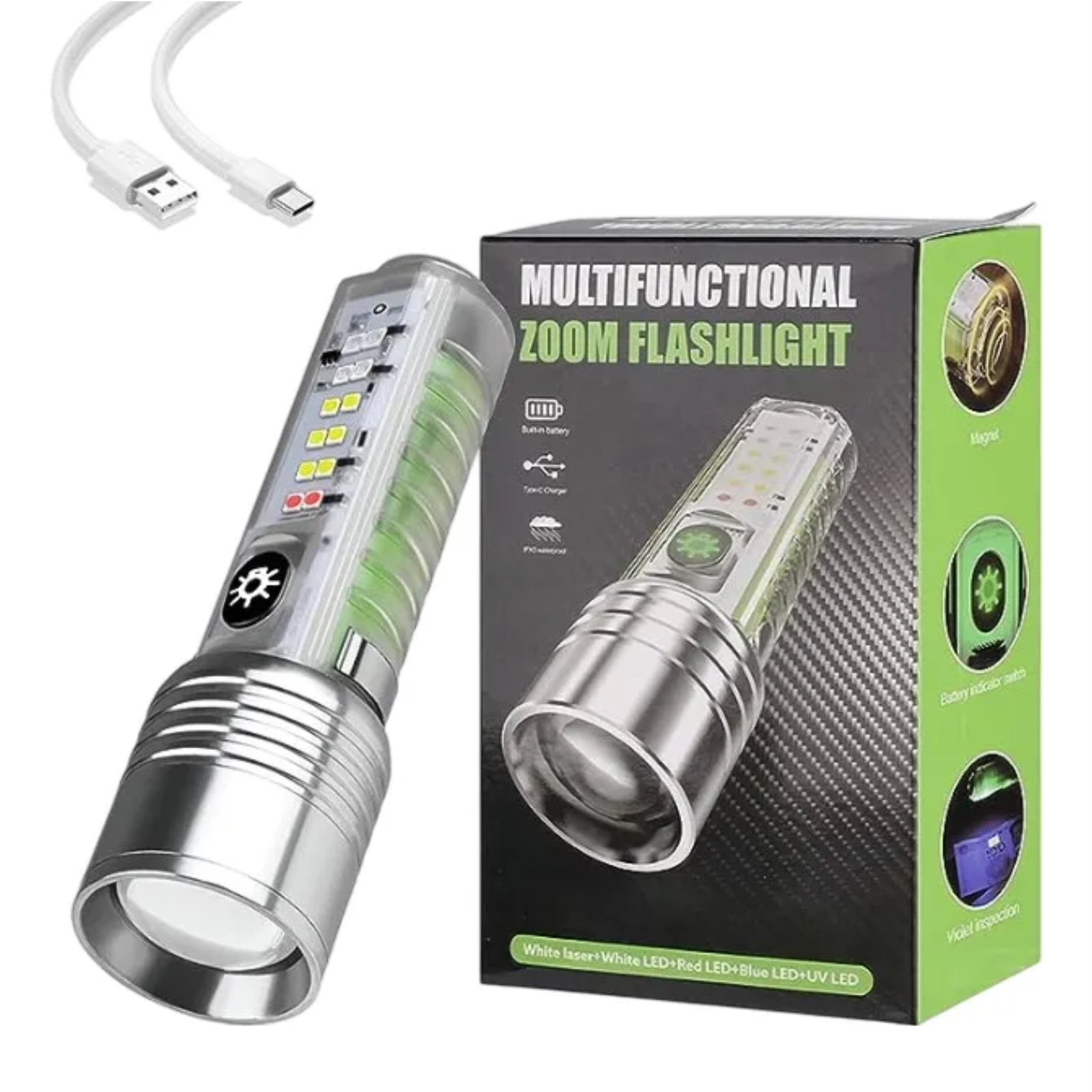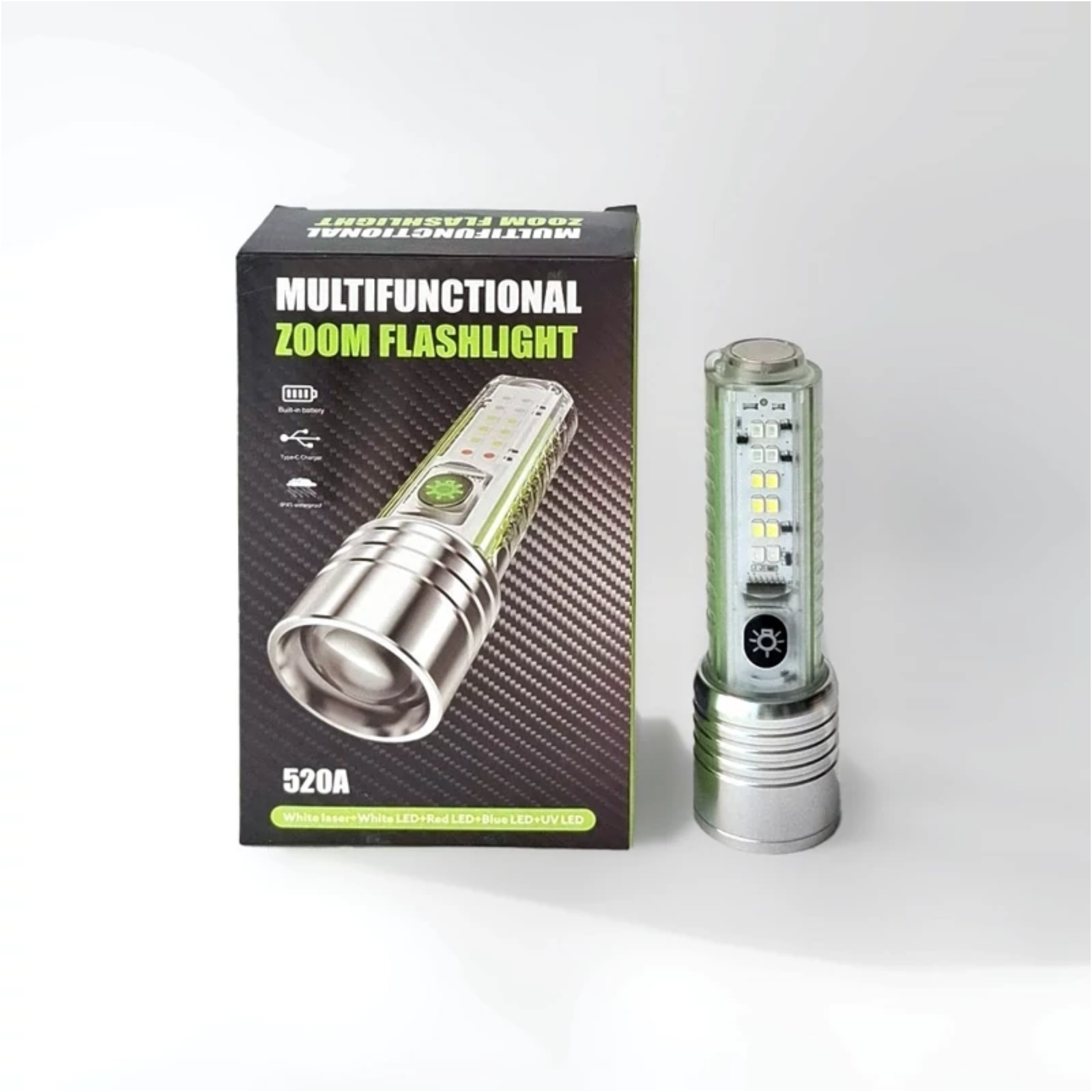 La linterna recargable 520A es una herramienta práctica y versátil diseñada para ofrecer iluminación eficiente en distintas situaciones. Cuenta con múltiples modos de luz, incluyendo LED blanco de alta potencia, luz roja, luz azul y luz UV, lo que la hace ideal tanto para uso cotidiano como para tareas específicas.