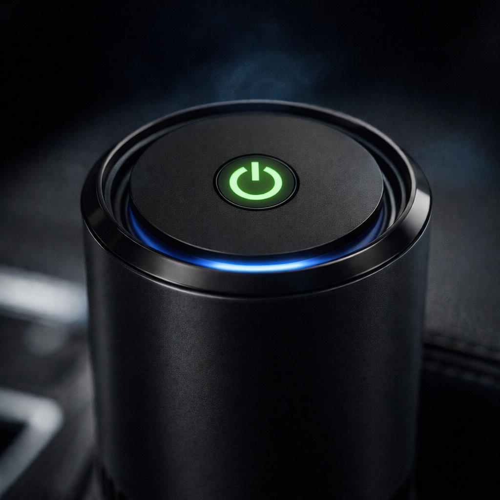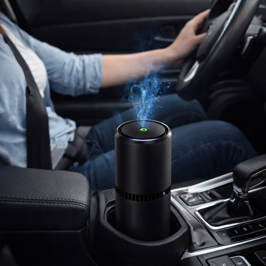 Se coloca el purificador en el portavasos del vehículo y se conecta a una fuente de energía (generalmente puerto USB o encendedor del carro). Al encenderlo, el dispositivo comienza a filtrar y purificar el aire dentro del vehículo.